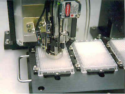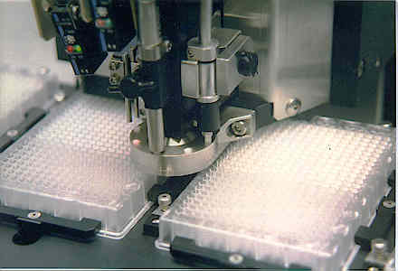 Stuffs soft, porous plastic frits into 384-well plates for biotech research.